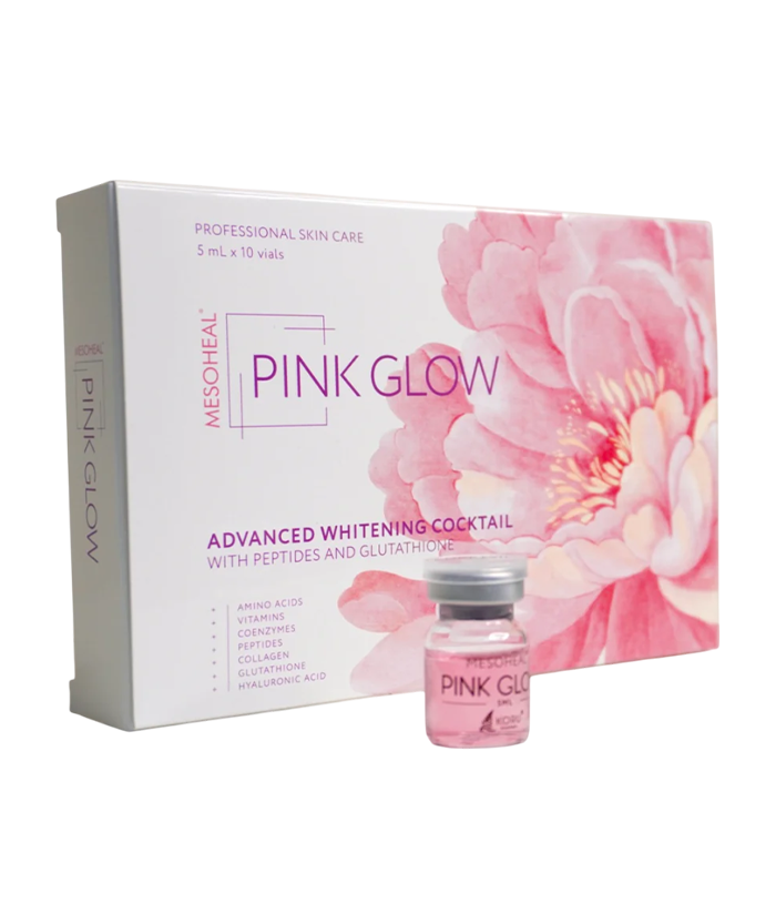MESOHEAL® Pink Glow is an advanced whitening cocktail developed by Koru Pharma, designed to lighten hyperpigmented areas of the skin and prevent the formation of new imperfections on the face and body. This ionic balancing formula combines over 50 active ingredients, including amino acids, vitamins, minerals, coenzymes, nucleic acids, antioxidants, and hyaluronic acid, to repair the skin layers, enhance hydration, and promote a radiant complexion. The formulation actively repairs the skin by replacing deficiencies of essential minerals such as magnesium, sodium, potassium, and calcium, making it especially effective for tired, discolored skin and conditions like melasma, age spots, and post-inflammatory hyperpigmentation.